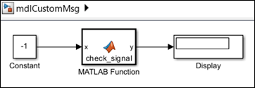 check_signalto display the custom messageSignal is negative, when the input to the MATLAB Function block is negative.function y = check_signal(x) if x < 0 error('Signal is negative'); else y = x; end