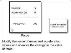 Double-click the block Force, modify the values of mass and acceleration in the mask dialog box and observe the results.