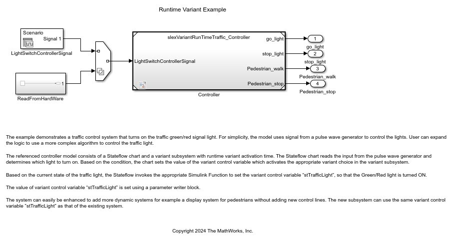 This example shows how to change the traffic signal lights for a traffic control system by using run-time variants.