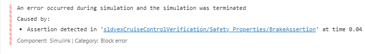 The BrakeAssertion block causes the simulation to terminate and produces an error.