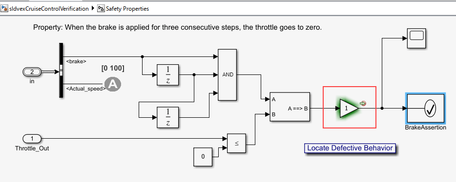 The Implies block lets you specify a condition to produce a given response. For example, If A is true, B is false, A ==> B is false, the model pauses at the breakpoint. The condition A ==> B in the Implies block is false when you apply the brake input for three consecutive time steps. This causes the throttle to go back to zero and induces the assertion from the BrakeAssertion block.