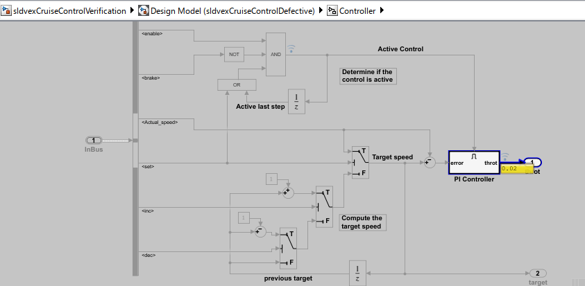2. Open the model and go to sldvexCruiseControlVerification/Design Model/Controller/PI Controller. Double click the throt output to open the Block parameters dialog box. Set Output when disabled to value to reset. Click Apply and OK.