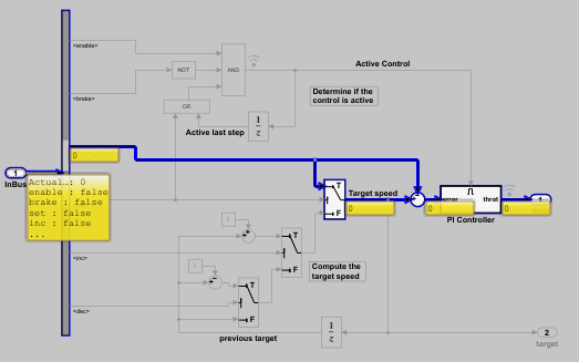 You can enable the control dependencies to see if the PI controller is enabled or not during a time step. The PI Controller block is not enabled at the simulation time (0.20). Additionally, observe that the port value label on the Active Control input to the PI Controller displays false.
