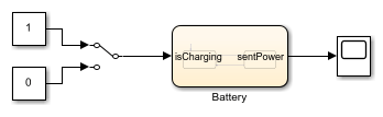 ChargeandFastChargeboth activate. Aschargeincreases, the chart transitions to child statesSlowChargeandFull. In the Symbols pane,chargenever exceeds100.Return to the top-level Simulink model. Toggle the value of the Manual Switch block by double-clicking the block.