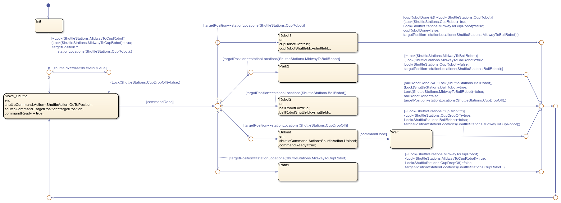 The Controllers chart models each shuttle and robot as a separate, masked atomic subchart, linked from the ShuttleAndRobotLibrary library. The robots link to one library chart and the shuttles link to another. For more information, see Create Reusable Subcomponents by Using Atomic Subcharts and Reuse Charts in Models with Chart Libraries.