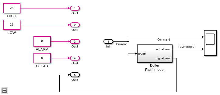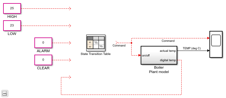 This example shows how to model a bang-bang controller for temperature regulation of a boiler, using a state transition table. The controller must turn the boiler on and off to meet the following design requirements: