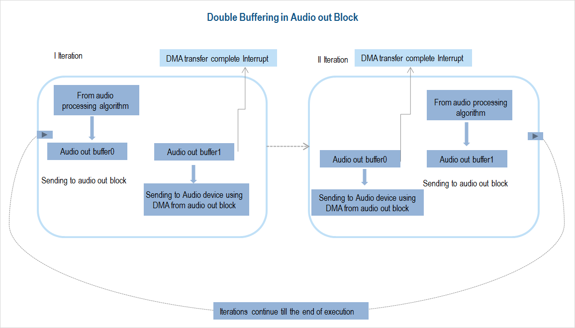 • In the second iteration, when the processed audio signal is sent out to the audio device from Audio out buffer0, the ‘Audio out buffer1’ is filled with the audio data from the audio processing algorithm.