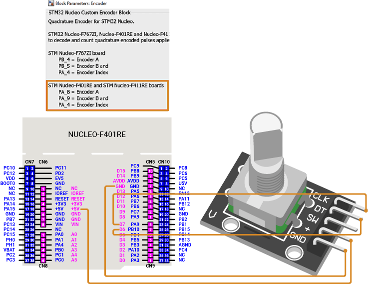 • Connect Nucleo pin PA_8 to Encoder pin A (CLK).