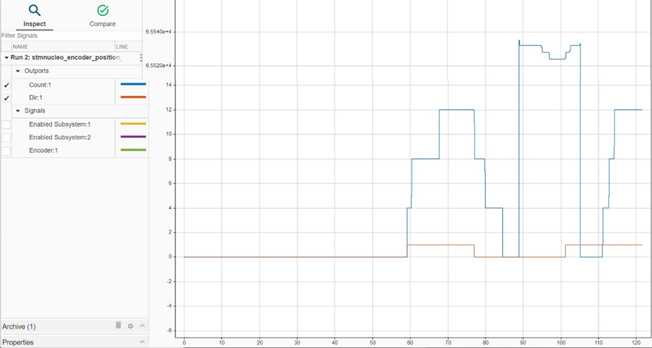 The example uses the Encoder device driver block and adds logic to report the direction of the encoder by using the encoder count information from the block. The block reports direction as '1' or '0', depending on the direction of rotation of the knob. You can also observe the direction in the Simulation Data Inspector as shown in the image. The image shows when the count rolls over for a count < 0 to 65535, but the direction continues to report the same value as the knob continued to be rotated in the same direction.