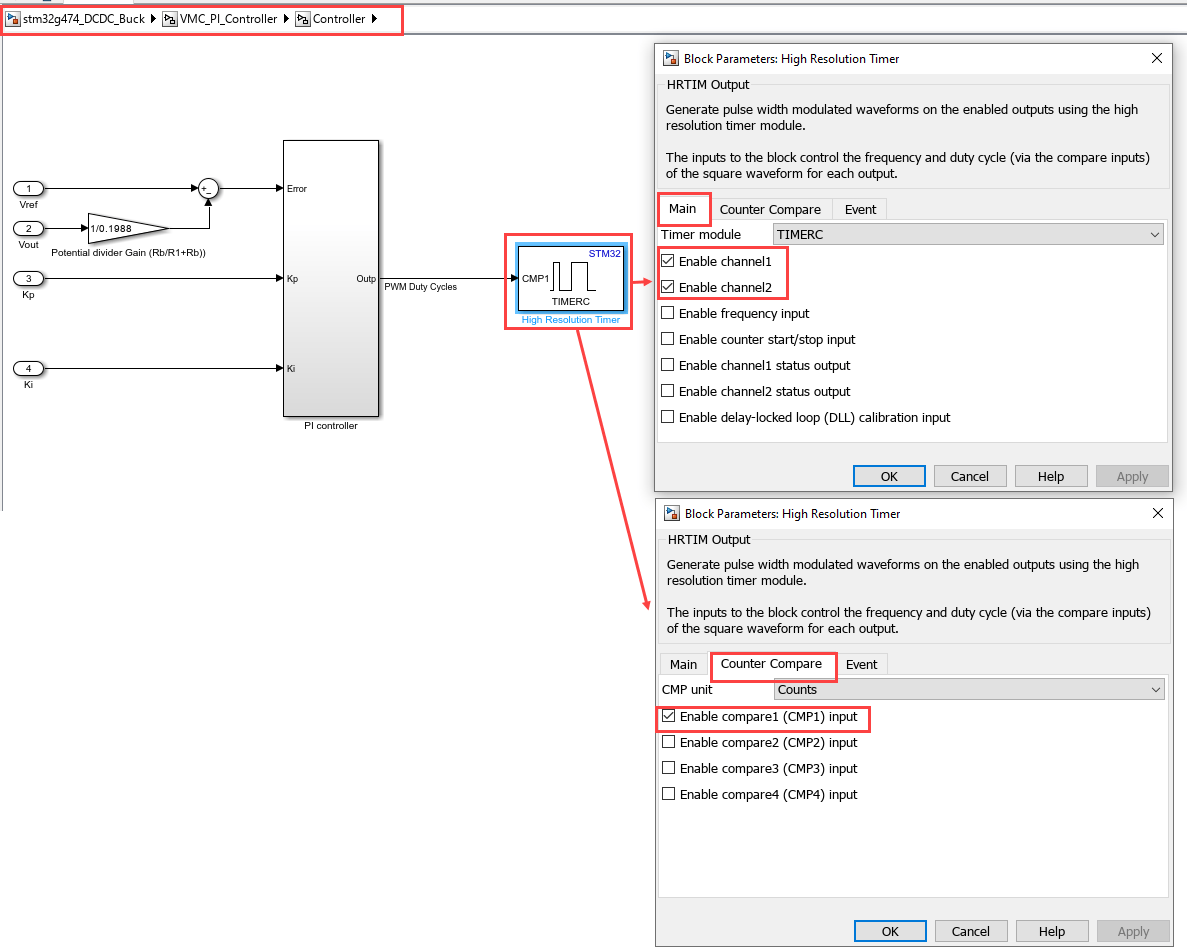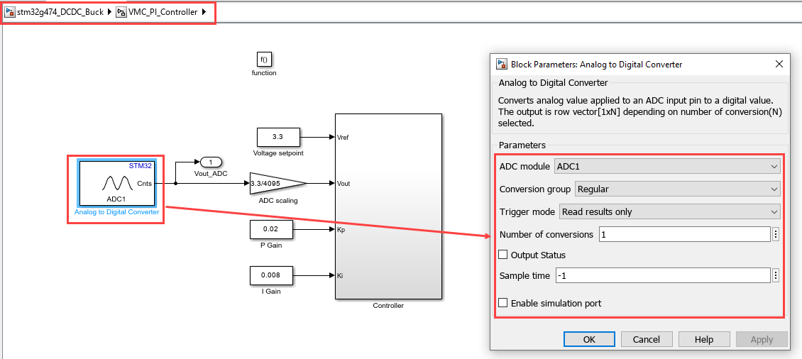 Set the peripheral block configurations for this model. Double-click the blocks to open block parameter configurations. You can use the same parameter values if you want to run this example on other hardware boards. The following configuration are shown for Buck converter model. You can perform the similar configurations for Boost Converter stm32g474_DCDC_Boost.slx model.