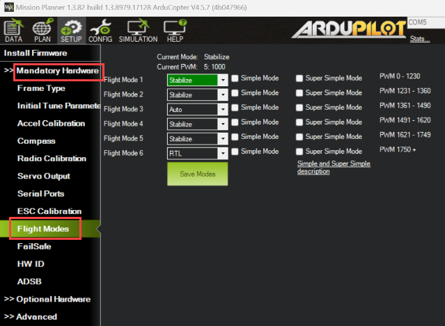 3. Go to Setup > Mandatory Hardware > Flight Modes in Mission Planner to map flight modes to different RC input ranges. This allows you to map specific flight modes to different ranges of values on the assigned RC channel.