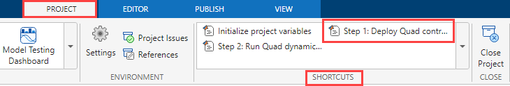 4. Click Step 2: Run Quad dynamics simulation in the Project Shortcuts tab to open the Quad_UAV_dynamics model.