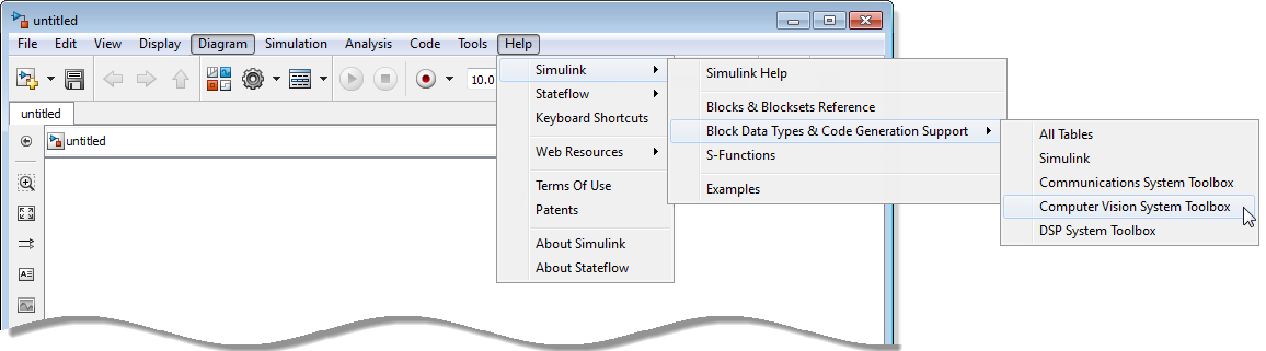 La tabella di supporto del tipo di dati Computer Vision Toolbox™ è disponibile tramite il menu Aiuto del modello Simulink®. La tabella fornisce informazioni sul supporto del tipo di dati e sulla copertura della generazione di codice per tutti i blocchi Computer Vision Toolbox. Selezionare Help > Simulink> Block Data Types & Code Generation Support > Computer Vision System Toolbox.