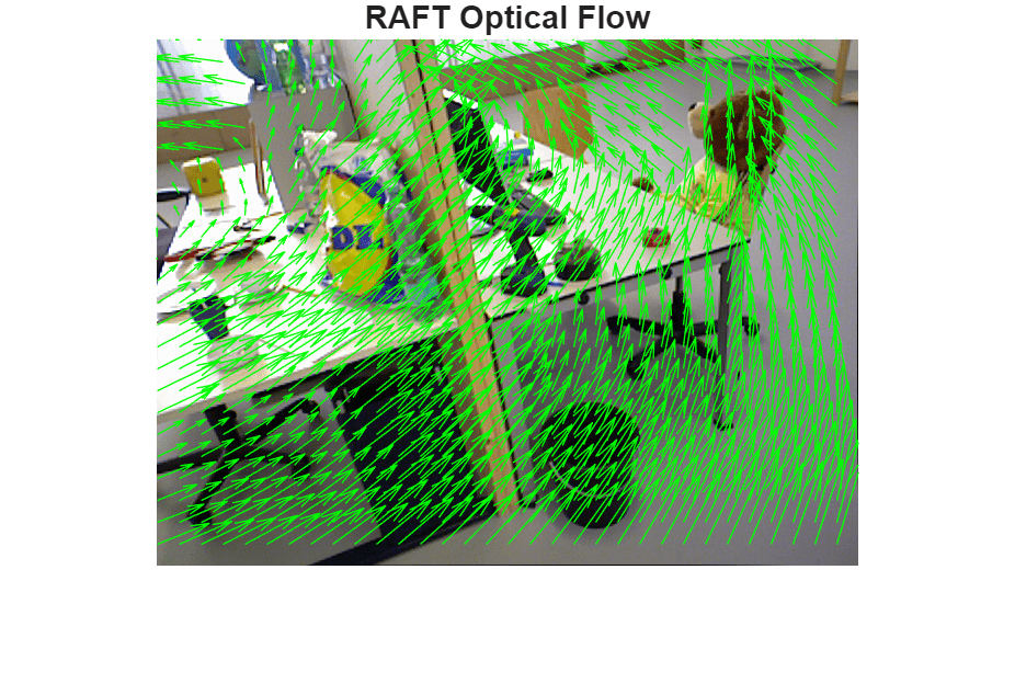 figure imshow(I1) hold on plot(flow,DecimationFactor=[20 20],ScaleFactor=3.0,Color="green"); title("RAFT Optical Flow") truesize
