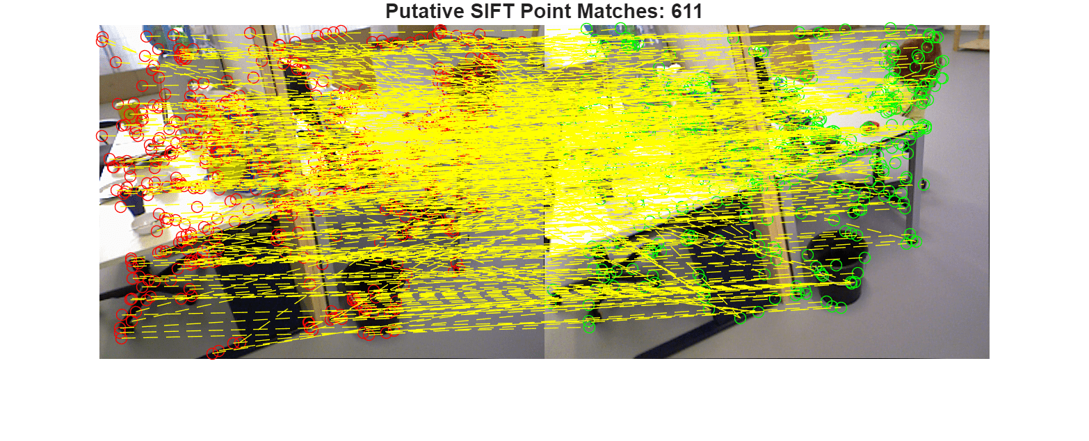 points1 = detectSIFTFeatures(im2gray(I1)); [features1,validPoints1] = extractFeatures(im2gray(I1),points1); points2 = detectSIFTFeatures(im2gray(I2)); [features2,validPoints2] = extractFeatures(im2gray(I2),points2); indexPairs = matchFeatures(features1,features2,MaxRatio=siftMaxRatio, MatchThreshold=siftMatchThreshold); matchedPoints1 = validPoints1(indexPairs(:,1)); matchedPoints2 = validPoints2(indexPairs(:,2)); figure showMatchedFeatures(I1,I2,matchedPoints1,matchedPoints2,"montage",PlotOptions=["ro","go","y--"]); title("Putative SIFT Point Matches: " + num2str(matchedPoints1.Count)) truesize