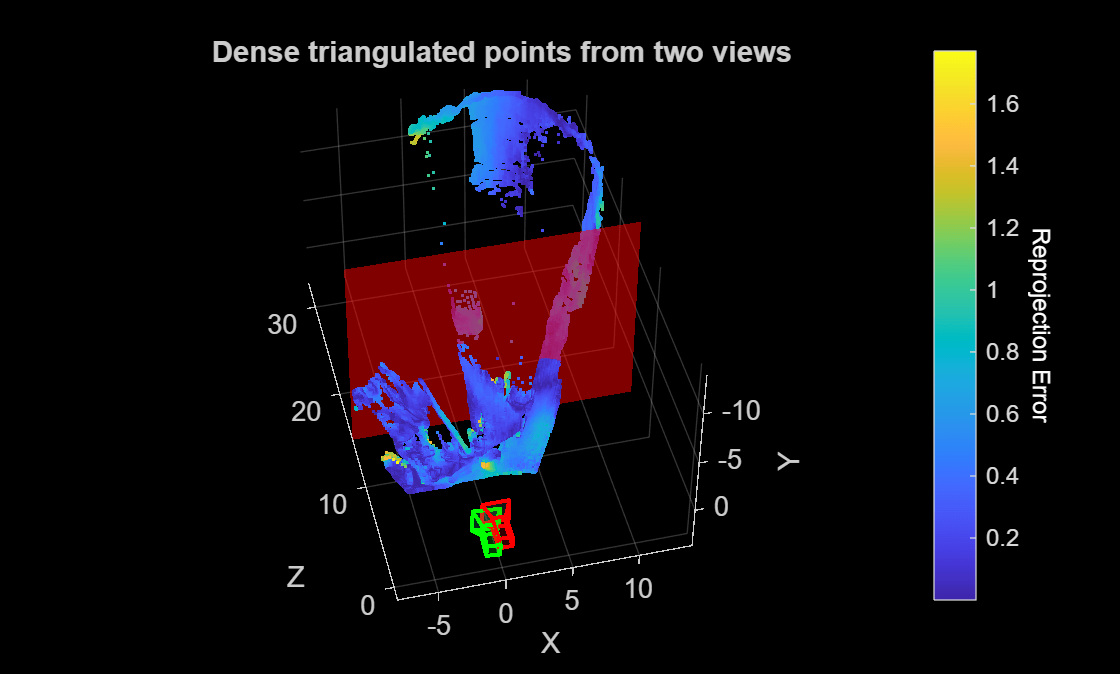 figure h1 = pcshow(points3D, reprojectionErr, VerticalAxis="y", VerticalAxisDir="down"); xlabel("X") ylabel("Y") zlabel("Z") hold on plotCamera(AbsolutePose=cam1Pose,Size=1,Opacity=0.1,Color="red"); plotCamera(AbsolutePose=cam2Pose,Size=1,Opacity=0.1,Color="green"); cb = colorbar; ylabel(cb,"Reprojection Error",Rotation=270,Color="white") title("Dense triangulated points from two views")
