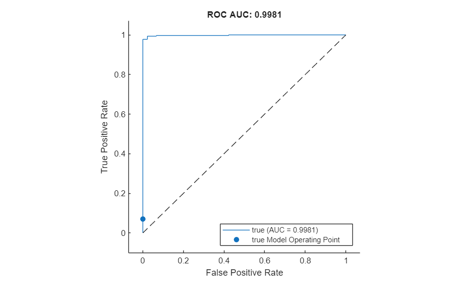 Plot the ROC curve by using the plot (Deep Learning Toolbox) object function of rocmetrics. The ROC curve illustrates the performance of the classifier for a range of possible threshold values. Each point on the ROC curve represents the false positive rate (x-coordinate) and true positive rate (y-coordinate) when the calibration set images are classified using a different threshold value. The solid blue line represents the ROC curve. The area under the ROC curve (AUC) metric indicates classifier performance, and the maximum ROC AUC corresponding to a perfect classifier is 1.0.