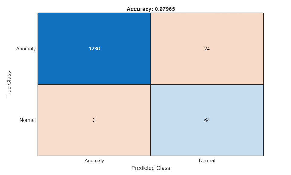 testLabelsGT = testSubclassLabelsGT ~= "Healthy";Calculate anomaly detection metrics by using the evaluateAnomalyDetection function. This function supports calculating the metrics of subclasses, so you can specify the ground truth labels as the anomaly subclass labels.