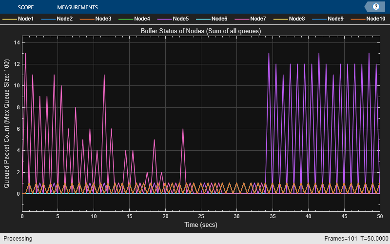 • Node 7 accumulates a higher packet count in its transmit queue between 0 and 23 seconds because it functions as a relay node on the paths from Node 1 to Node 4 and from Node 5 to Node 10. Node 7 buffers all packets originating from Node 1 and Node 5 for forwarding to their respective destination nodes.