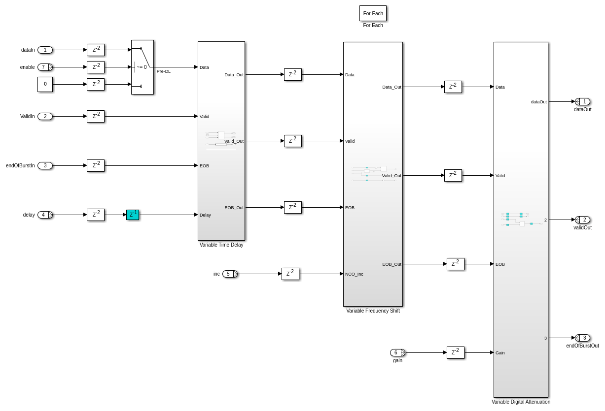 2. The variable time delay buffers the input samples in memory for the number of samples specified by the delay port.