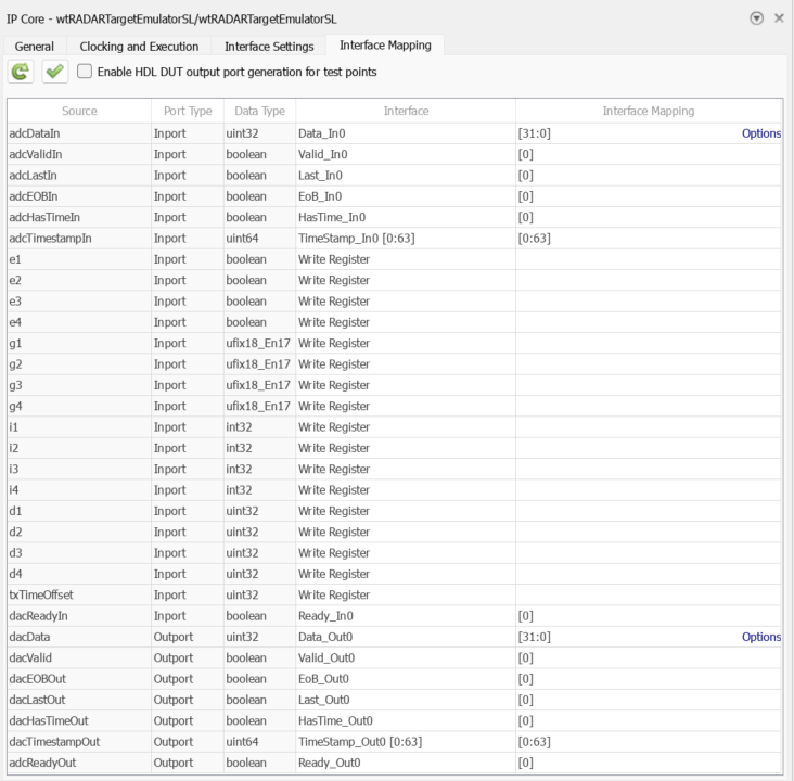 2. In the Interface Mapping tab, reload the port interface mapping options by clicking Reload IP core settings and interface mapping table from model: