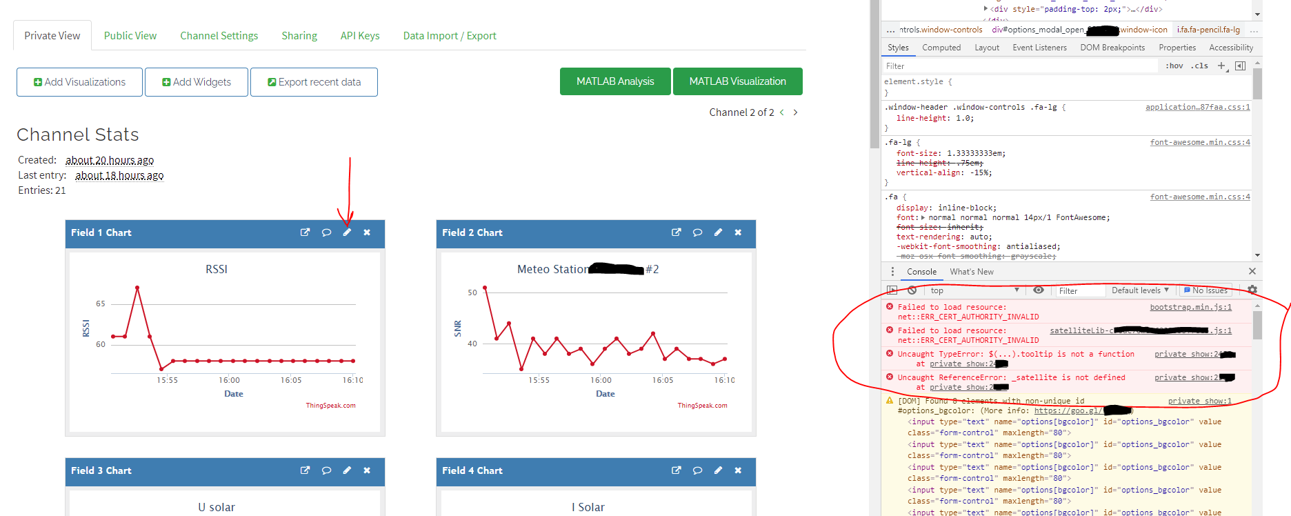 I can't edit charts with the pencil icon, tried different sort of webbrowsers in windows 10 and also different pc's. When i try it on my android phone it does work perfectly with the same wifi connection? When i inspect the pencil object in the chrome browser it shows some warnings, see picture