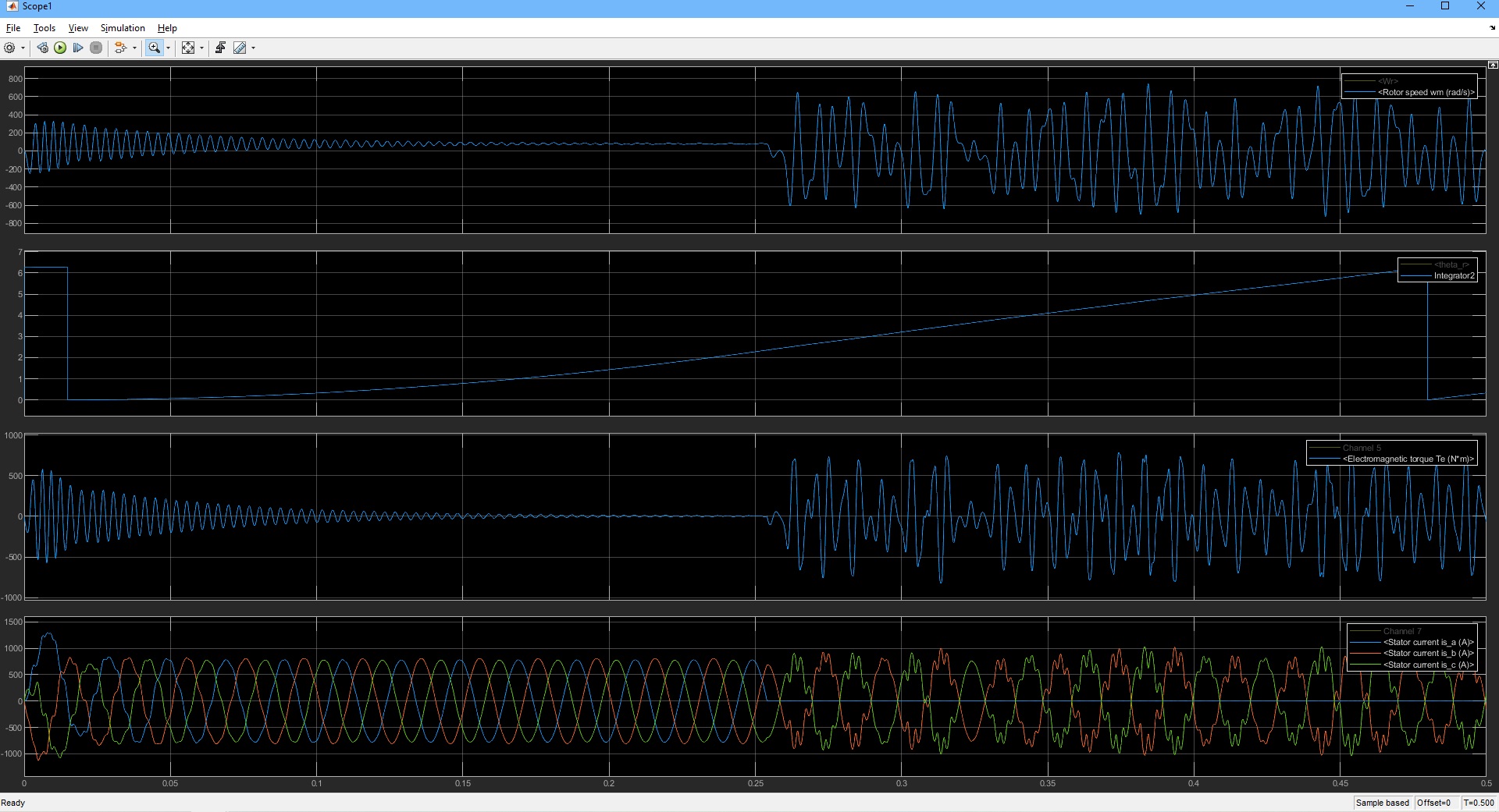 I am trying to simulate the PMSM in fault mode with phase loss at 0.25 sec, but the simulation results are incorrect. For example, the rotor speed changes too much when a phase is missing. I tried to assemble the model in dq coordinates and abc coordinates on my own, but the results are the same. Who can tell you how to modify the engine model so that the simulation shows the correct results?
