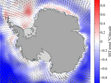An example of how one might use this function is shown in the image at the top of this page. To create this image I used daily surface wind and sea surface temperature fields (ECMWF ERA-Interim) from 1990 through 1999 to solve for trends in SST, zonal wind, and meridional wind. In the 90s, the sea surface cooled around most of Antarctica, but warmed in the Weddell sea, where the meridional component of surface winds strengthened.